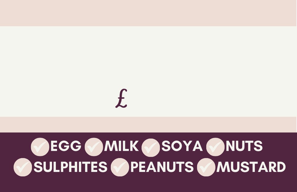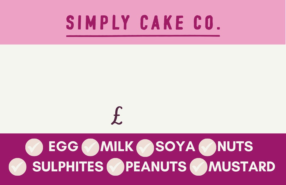 A double-sided counter label for your retail display. Each label includes a premium branded side featuring the Simply Cake Co logo for a polished presentation and a versatile unbranded side for neutral merchandising options. Both sides display the product name and complete allergen information, with a dedicated space for customisable pricing. The complete set includes individual labels for all standard Simply Cake Co products, plus 6 blank “Specials” labels for seasonal items or custom creations. Perfect for bakeries, cafés, and food retailers seeking flexible, professional product identification.